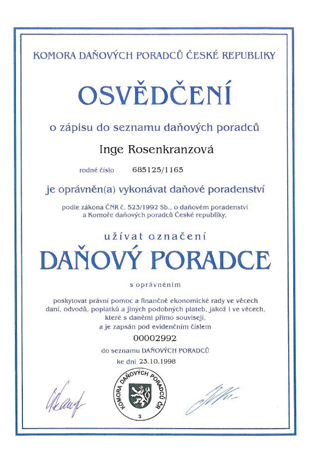 Osvědčení o zápisu do seznamu daňových poradců